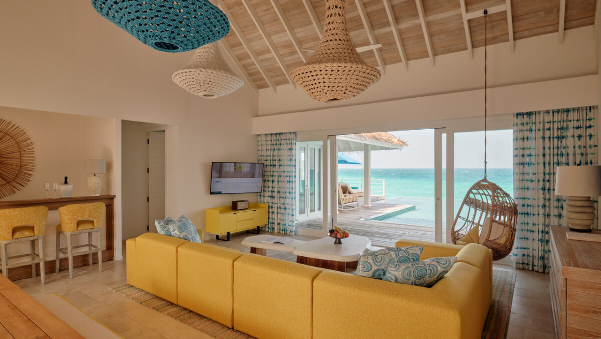 The villas are inspired by the elements that surround them. Those set above the water blend contemporary design with natural textures, offering endless views of the shimmering lagoon. Beachfront villas, wrapped in greenery, open to secluded stretches of sand and gentle ocean breezes. Each space is bright, playful and beautifully considered, with touches of retro chic and tropical artistry that give the resort its unmistakable personality. For something truly unforgettable, the Beach Bubble invites guests to spend a night beneath the stars in a transparent dome set at the far end of the sandbank – an experience of absolute seclusion and wonder.